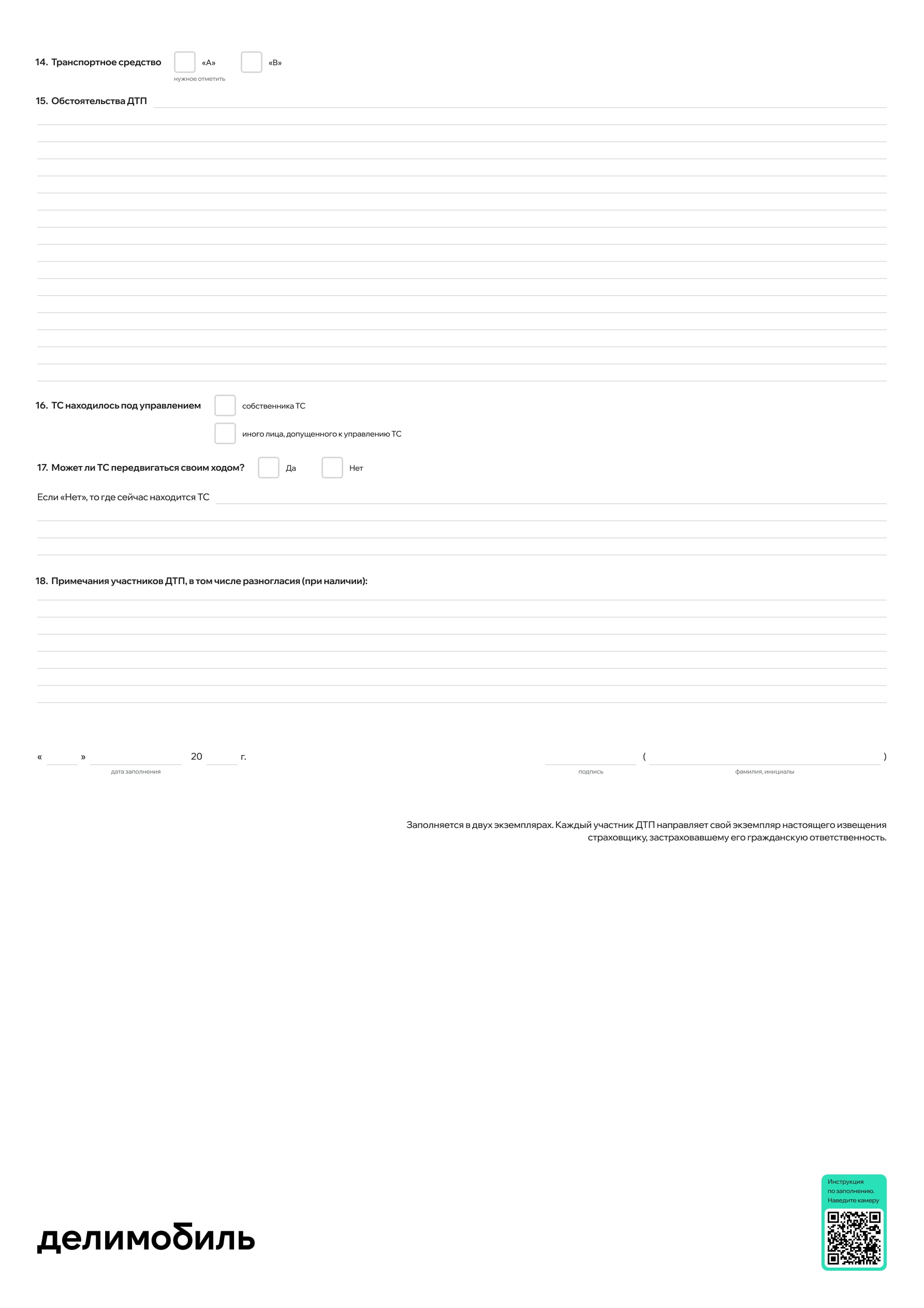 Описывайте аварию так, как считаете нужным. Чем подробнее, тем лучше. Строки, оставшиеся на оборотной стороне бланка незаполненными, важно перечеркнуть: так в них никто ничего не сможет дописать.