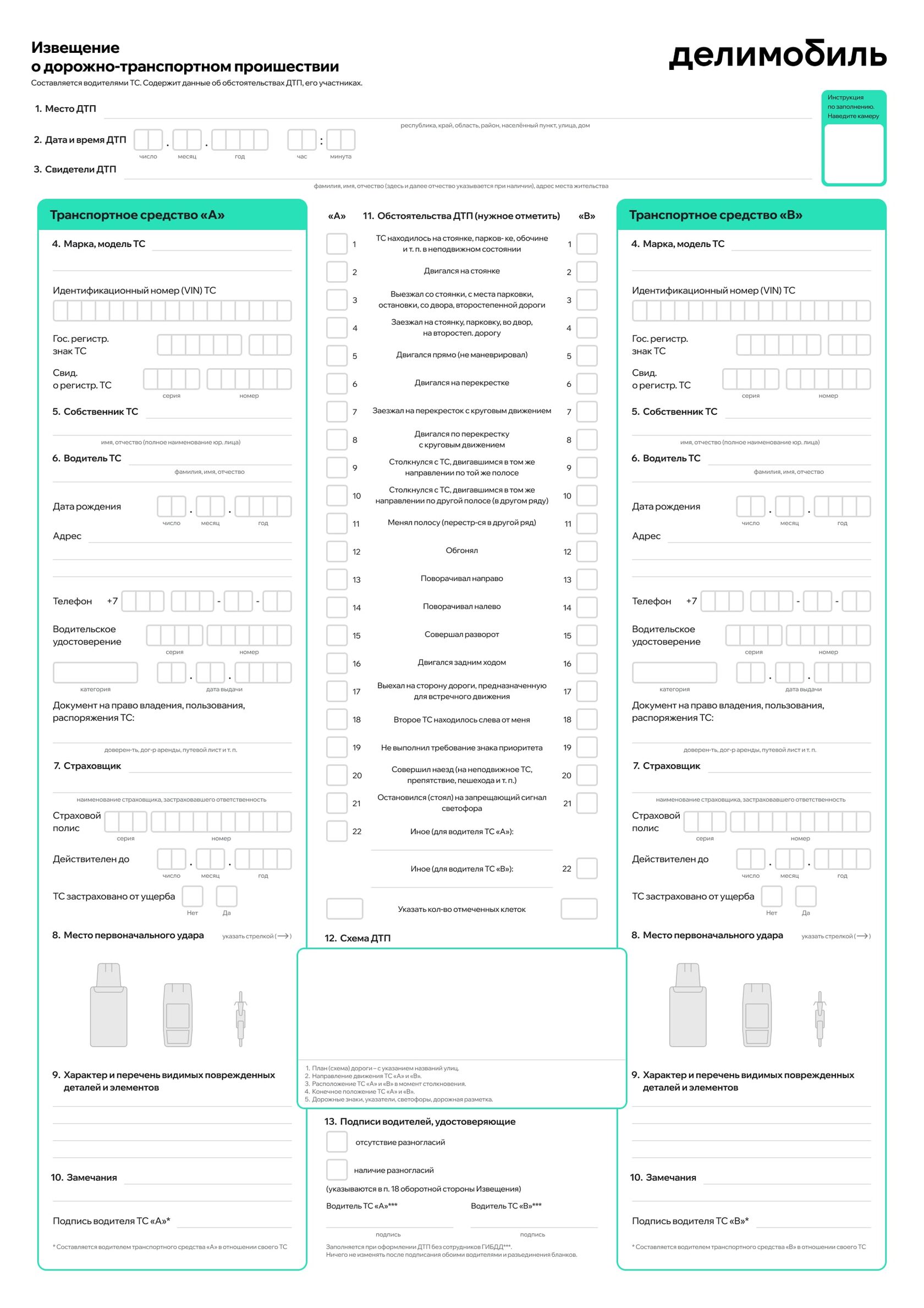 Бланк европротокола лежит в бардачке делимобиля. Если бумажного бланка с собой не оказалось, можно попросить его у второго участника. Когда у обоих водителей не оказалось бумажного бланка, его нужно распечатать. Если такой возможности нет, попробуйте попросить у водителей стоящих рядом или проезжающих мимо машин.